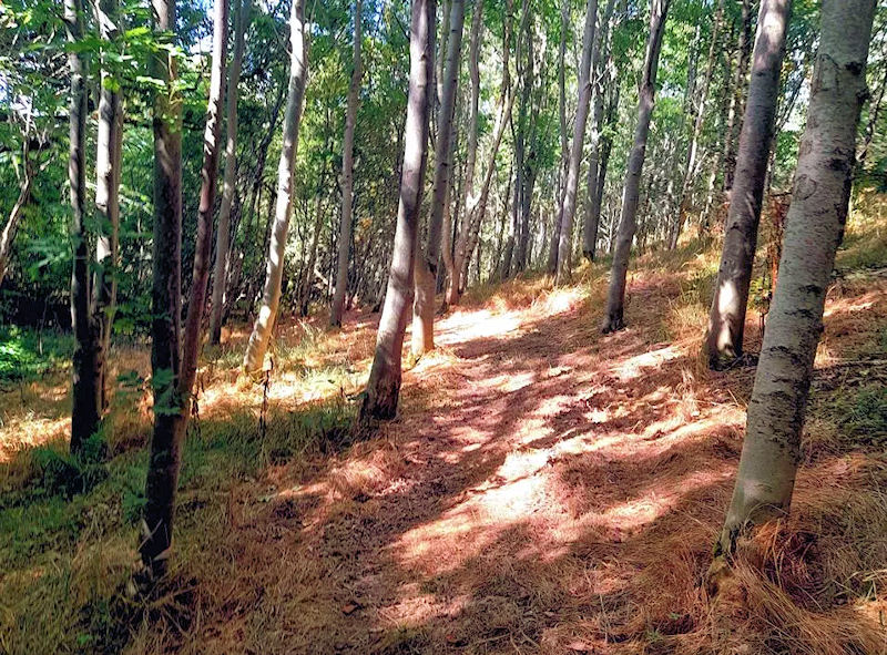 Set along a gentle incline at Porth Farm, Woodland Wander invites you to explore three acres of winding pathways beneath a canopy of oak, birch, rowan, holly, silver birch, and elm.